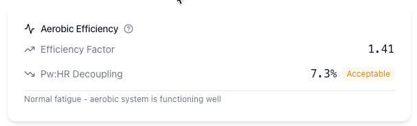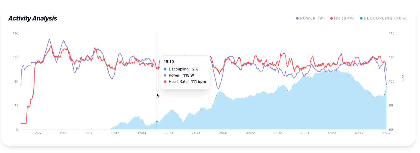Decoupling measures the "drift" between your Power (external load) and Heart Rate (internal cost).